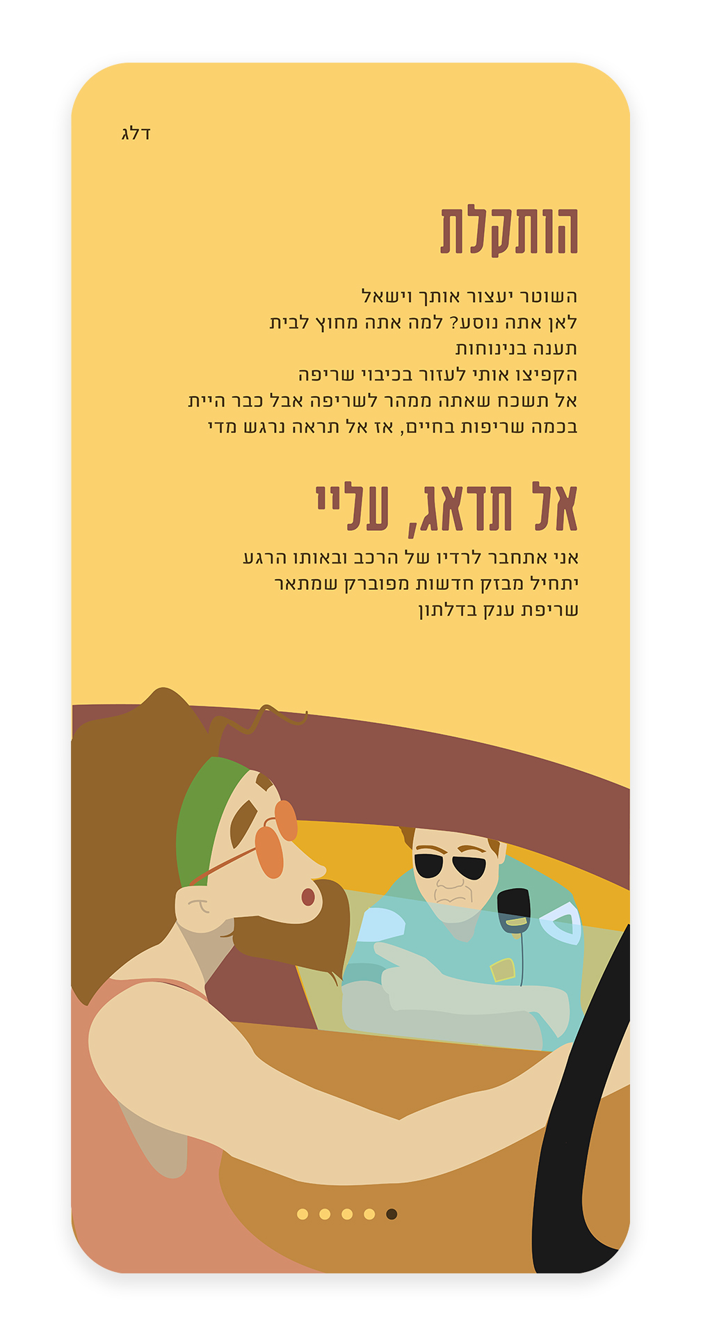 The combination between chill users and the stressful situation with the policeman is problematic. Therefore, it was necessary to design the interface in a pleasant way that would suit the hippie vibe. I did this through illustrations, abstract shapes, natural colors and typography that makes the situation accessible for the user.